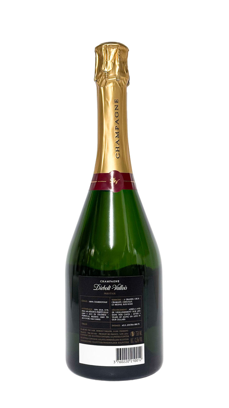 Procedente de viñedos Grand Cru en Cramant, en el corazón de la Côte des Blancs, este Diebolt-Vallois Blanc de Blancs Prestige Extra Brut es una expresión refinada del Chardonnay de suelos calcáreos profundos. El ensamblaje combina vinos de 2018 (33 %), 2020 (51 %) y una réserve perpétuelle (16 %) mantenida en grandes fudres de roble desde 2009 hasta 2019. El tirage se realizó en 2021, seguido de una larga crianza sobre lías antes del degüelle, con dosificación mínima (Extra Brut).
